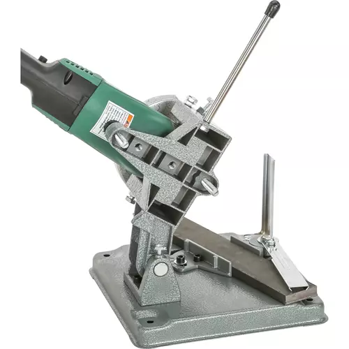 Turn your portable 4-1/2″ grinder into a metal-cutting chopsaw! This heavy-duty metal stand doubles the versatility of your portable grinder, making it the perfect tool for cutting tubing, bar stock and rebar. Designed to hold most common grinders with side handles without modifications, the benchtop stand features a cam-clamp vise that adjusts from 90° – 45°. A spring-action return and built-in swarf guard provide excellent safety and convenience. Base measures 9-1/2″ x 9-1/2″. Grinder not included. Specifications & Comparisons